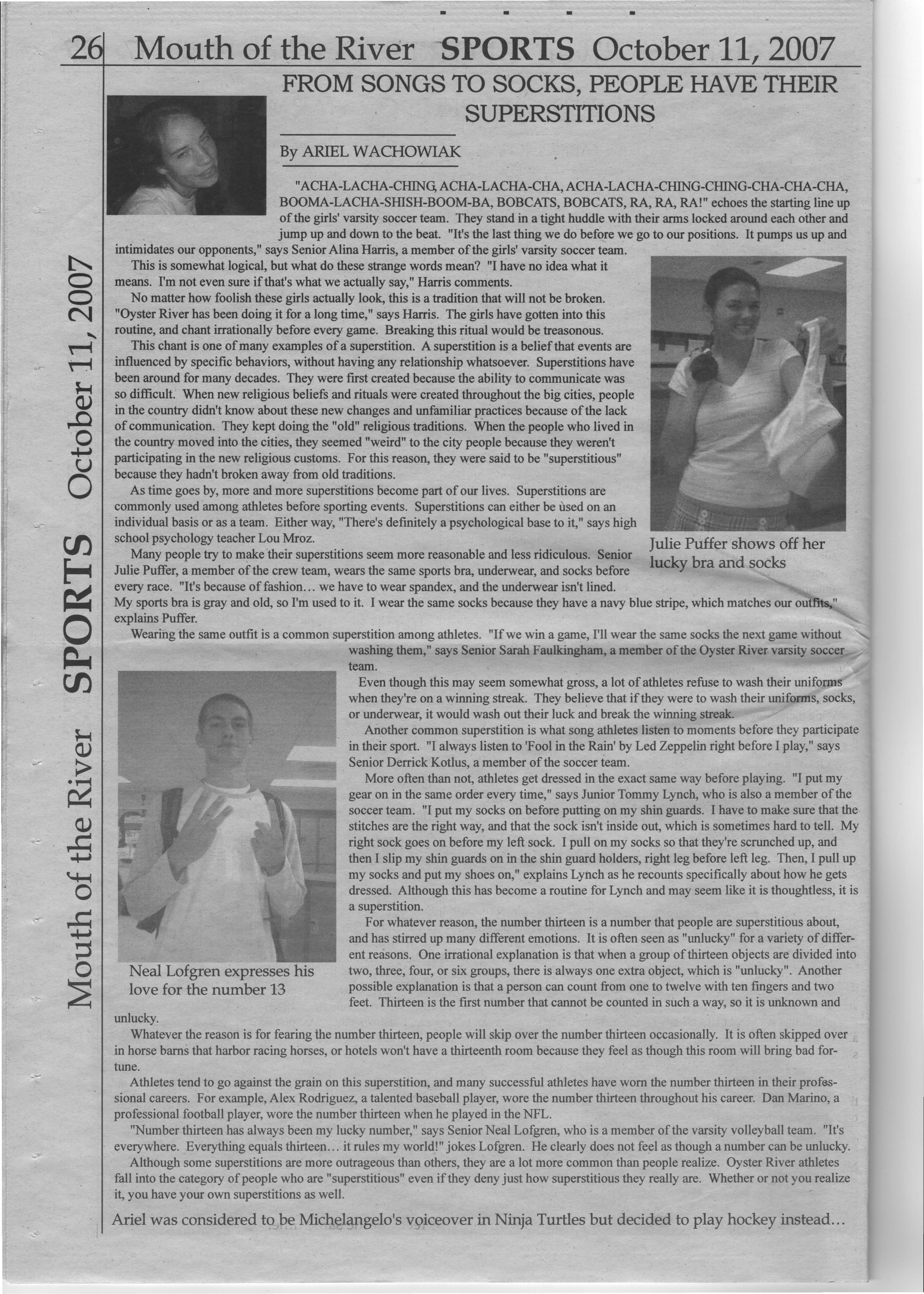 Wearing the same outfit is a common superstition among athletes. "If we win a game, I'll wear the same socks the next game without washing them," says Senior Sarah Faulkingham, a member of the Oyster River varsity soccer