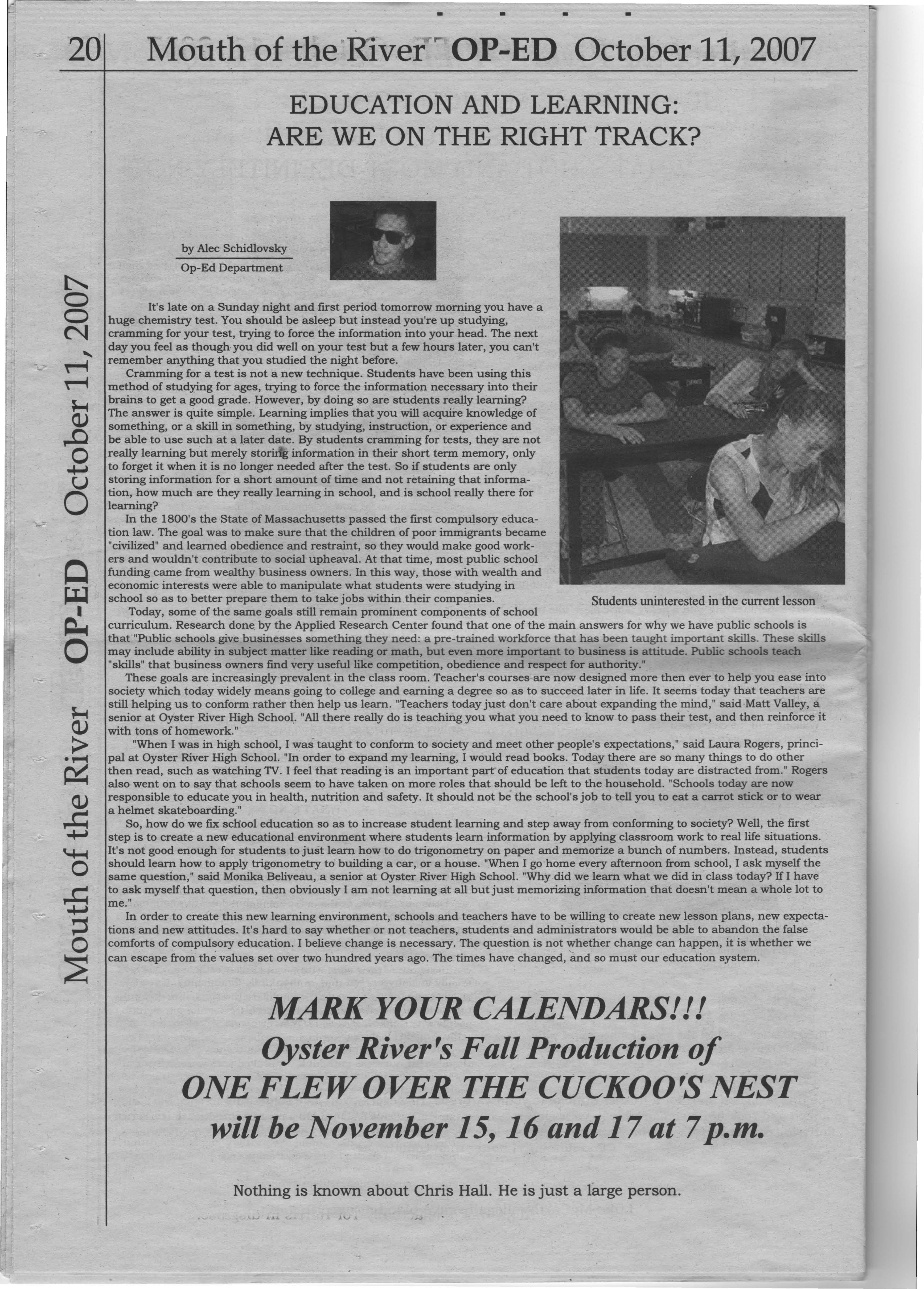 The aforementioned Nicholson, a sponsored and by all means avid skateboarder, is also taking AP Calculus this year at Oyster River. Nicholson is not an anomaly. Looking around the higher level classes, and even the class ranks, you are sure to fmd a few skateboarders in the mix. "Being a skater doesn't mean any more than being a musician or a soccer player, and many people don't recognize that," says another nameless freshman.