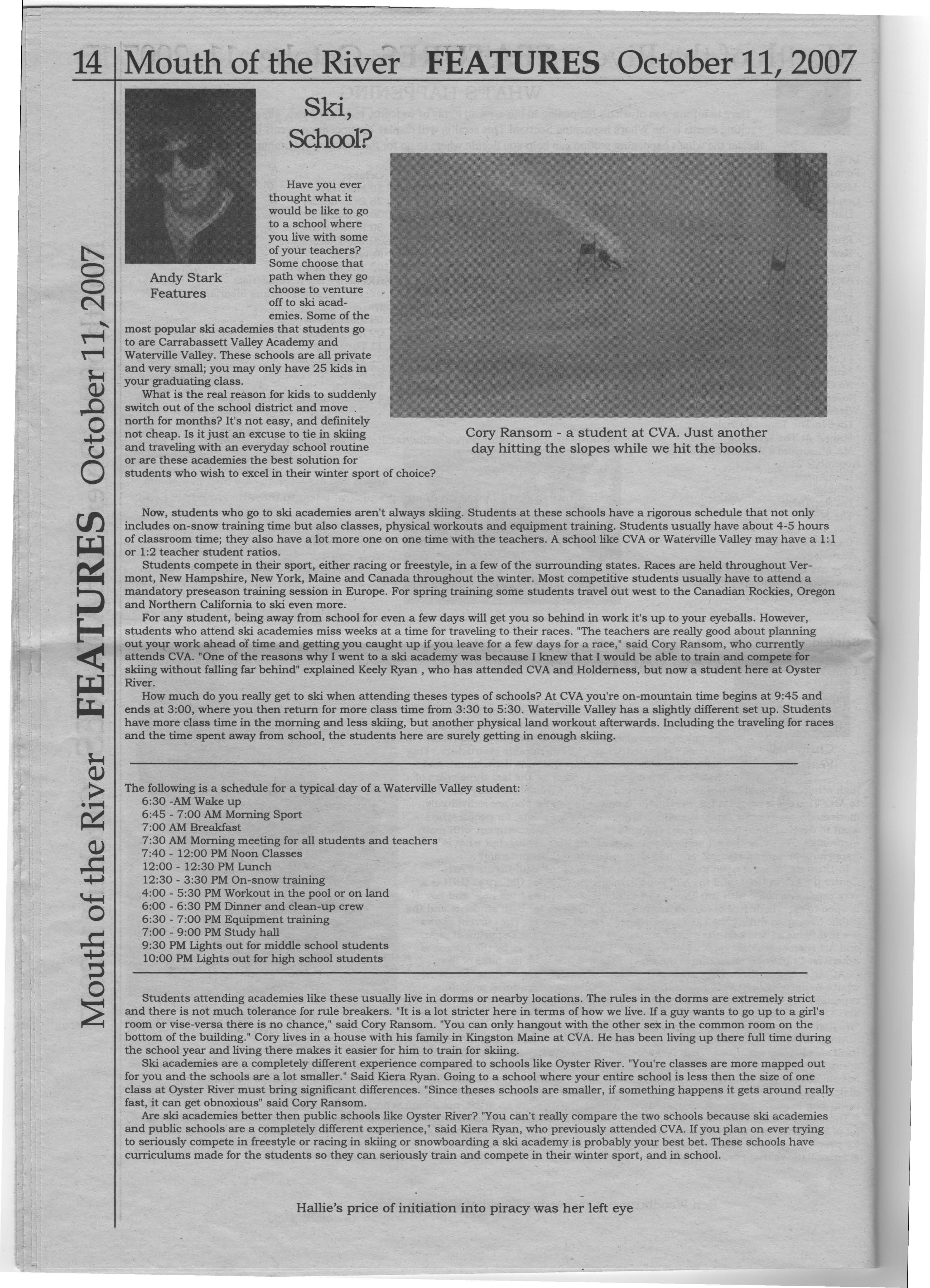 brother. Where is he the rest of the time? Boarding in the dorms at Carrabassett Valley Academy' a Skiing school that is "in the middle of nowhere Maine," according to Ransom. Giant slalom is his forte. Currently, his hair is approximately 4 Y2 inches, he weighs 132 pounds and stands 5'9" tall. (Who knew that our Cory could outgrow us?) Ransom has a very busy schedule, considering that his school day goes from 7:30 am to 6:00pm. His fall sport is soccer, and if he ever has time he likes to meet up