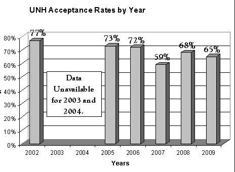 The college essay, recommendations, course selection, and resume are all very important parts of the admission process, but it is very difficult to put a numerical value on these. When prospective students are considering the difficulty of getting into a college they look at the numbers like GPA, SAT scores, etc. According to UNH Director of Admissions, Robert McGann, they look for students that have had “a solid high school performance.” McGann said that this is generally an average of a B or B+. When it comes to class rank in high school the average UNH student was between the top 25 and 10 percent in their class and only 2% were in the bottom fifty. The average UNH student had a GPA of a 3.33. In regards to SAT scores the average UNH student had a combined SAT score of 1742.