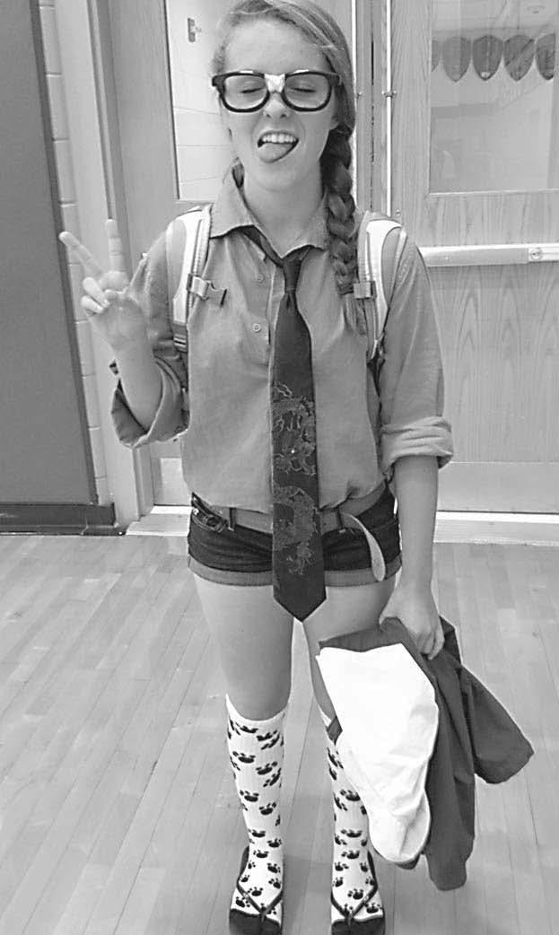 Ellexus “Lexi” Nash chucks up the deuces in her nerd outfit.