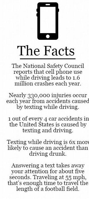 The average time a person takes their eyes off the road while texting or going on their phone is 5 seconds, going 55 mph that is enough time to travel the length of a football field. You may think that you are capable of texting and driving, but nobody is capable of safely traveling the length of a football field without looking at the road once.