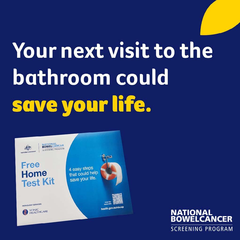 The Bowel Cancer Program sends a free at-home bowel cancer screening kit every two years to eligible Australians aged 50-74. To request a kit, call 1800 627 701