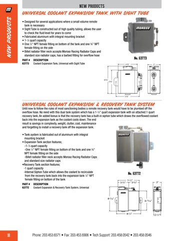 UNIVERSAL COOLANT EXPANSION & RECOVERY TANK SYSTEM Until now to follow the rules of most sanctioning bodies a remote recovery tank would have to be plumbed off the overflow hose. No need with this dual tank system which has a 1-1⁄4" quart expansion tank with an attached 1 quart recovery tank. An added bonus is that the recovery tank has a built-in siphon tube which draws the overflowed coolant back into the expansion tank as the coolant cools down. The end result is savings in complexity, weight, clutter, cost, maintenance and forgetting to install a recovery tank off the expansion tank. • Tank system is fabricated out of aluminum with integral mounting bracket • E xpansion Tank section features; -1-1⁄4 quart capacity -One 1⁄2" NPT female fitting on bottom of the tank and one 3⁄8" NPT female fitting on the side -Billet radiator filler neck accepts Moroso Racing Radiator Caps and standard size radiator caps • Recovery Tank section features; -1 quart capacity - Internal Siphon Tube which allows the coolant to recirculate from the recovery tank back into the expansion tank 1⁄4" NPT female fitting on bottom of the tank PART # 63772