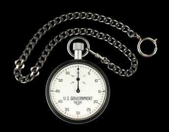 Case: 2” Dia. Heuer U.S. Government white metal stop watch with 14” chain. Diameter measures. 2-1/8”. Movement marked “Heuer 7700, Seven 7 Jewels, Unadjusted, Swiss.” Inside case-back marked “HeuerLeonidas SA, Swiss, 734548.” Crystal is loose. Running and functioning properly. (Very Good-Excellent). 100 - 200