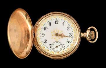 Case: 2” Dia. 14k yellow gold Waltham hunting cased pocket watch. Movement #4488140. Marked “14K”. Case measures 55mm in diameter. Gross weight is 144.4 grams. Tight hairline cracks to dial. Stops and starts. (Very Good). 800 - 1,200