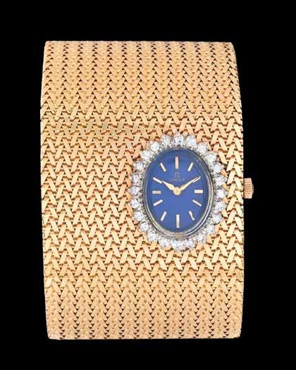 Ladies’ 14k yellow gold wide mesh bracelet with Omega watch mounted. Watch has diamond bezel and blue dial. Not running. Marked “14K” on reverse. Width measures 1-5/8”. Overall length measures 7-1/4”. Gross weight is 95.5 grams. (Very Good). 4,000 - 6,000