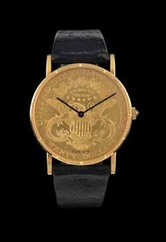 Box: 10 - 3/4” x 3 - 5/8” x 1”. Corum 18k yellow gold 1904 US $20 double eagle gold coin watch with original box and papers. Model number 5514556. Movement number 62777. Strap is worn but includes it’s original 18k gold Corum tang/buckle. Mechanical wind movement, running. (Very Good-Excellent). 2,000 - 4,000