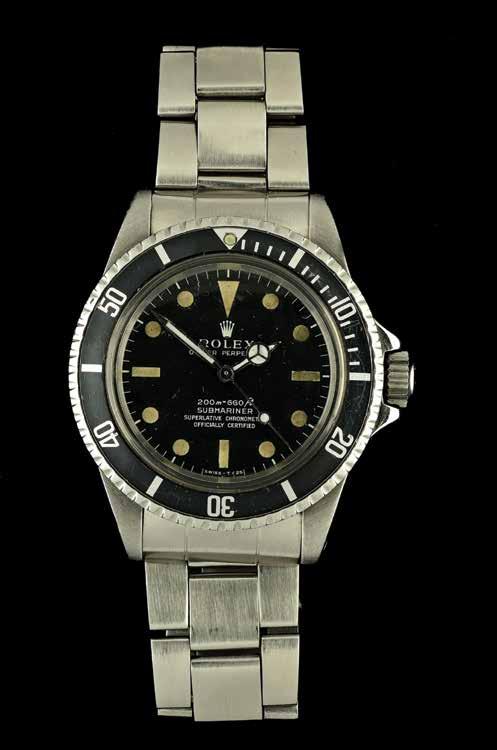 Men’s vintage Rolex Oyster Perpetual 200m/660ft Submariner 40mm watch in stainless steel with black dial and bezel insert. Reference #5512. Serial #1585764, c. 1967. Oyster bracelet with 10 hole clasp marked “9315” on last link, “6521H on clasp blade, date coded “1/68” on opposite clasp blade with “380” ends and original over wetsuit diver extension within clasp, marked with misspelled “PATETED” with Rolex logo. Dial marked “SWISS-T<25” with original lumes. Hands appear to have been re-lumed at some point. Watch is running. (Very Good-Excellent). 14,000 - 20,000