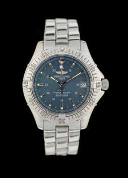 Breitling 1884 Colt automatic chronometer 38mm wristwatch in stainless steel with date and blue dial. Reference number A17350. Includes original international warranty certificate, service booklet and new genuine Breitling dark blue strap with steel tang/buckle and white stitching. Original bracelet shows scratches from regular use. Watch is in excellent working order. (Very Good - Excellent). 1,000 - 1,500