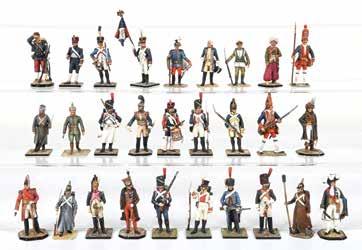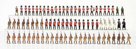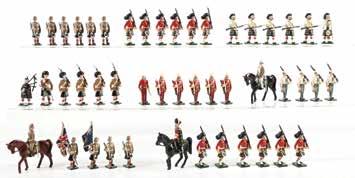 Largest: 3” T. Includes: French Pilou, 8 pieces; Spanish Infantry, 8 pieces; King’s Royal Infantry, 8 pieces; Coldstream Guards Present Arms, 8 pieces; Scots Guards ground arms, half boots, 9 pieces; unpainted round base figures, 7 pieces; and 1 Highland Officer. (Good - Very Good). 200 - 300