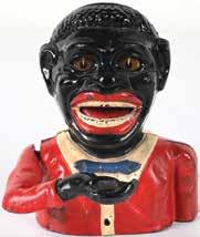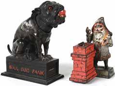 4 - 7/8” x 4” x 11 - 3/8”. C. 1886. Original locking coin trap has new paint to match bank, detectable only by blacklight. Very fine stable hairline crack on rear of platform behind right foot. Bank is otherwise in original condition. (Very Good - Excellent). 1,000 - 2,500