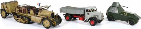 Largest: 12 - 1/2” x 4 - 3/4” x 5 - 1/2”. (A) Contemporary French Troop Carrier with Trailer. (B) Polish Armored Car Volkspolizei. (C) Arnold Farm Truck. Dump bed is very warped. Tail gate intact. (Good). 150 - 250