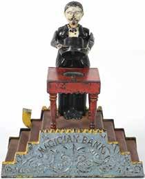 1022 - J. & E. STEVENS MAGICIAN BANK 6” x 4” x 5”. 100% original with exception of replaced coin trap. Paint crazing on the face. (Very Good Plus). 1,000 - 3,000