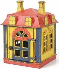 7 - 1/2” x 3” x 4” Circa 1889. Scarce bank. Currently not working. Touch-up to roof. Otherwise original. Rare. (Excellent). 5,000 - 20,000