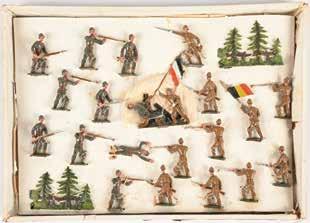 Largest Box: 10” x 5” x 3”. Includes mostly German infantry figures, with 1 French infantry figure. 12 pieces. (Excellent). 250 - 350