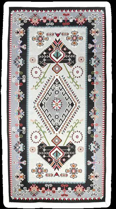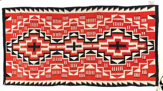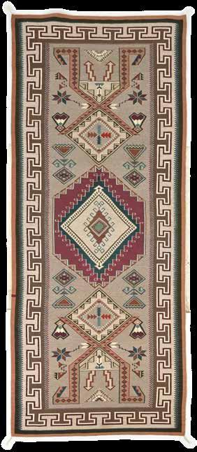 (B) First quarter 20th century. A runner with a central vertical row of serrated diamonds flanked on each side by eagle feather designs, enclosed in a triple border.