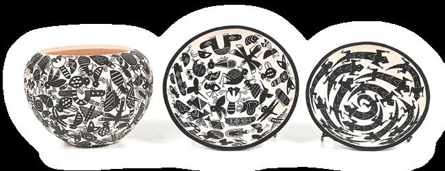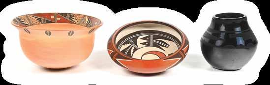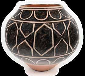 Incised on base “Robert Tenorio Santo Domingo Pueblo NM”. With outstretched wings bird design on base of interior, surrounded by curvilinear patterns. Exterior covered with a wide band of repeating geometric pattern.