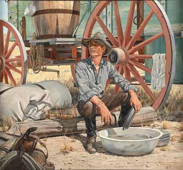 Saddlin’-up ‘fore Sun-up oil on canvas signed lower-right, “Eric Michaels” sight: 18” x 24” framed: 24-1/2” x 30-1/2”