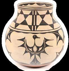 Signed on base “Ruby Panana / Zia”, underlined, with partial wear to signature. With three vignettes encasing Zia bird design, flanked on each side by a vertical column of floral and geometric design.