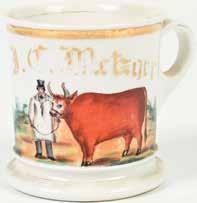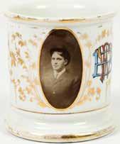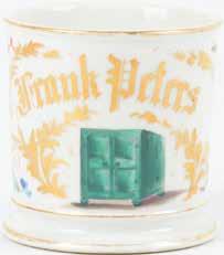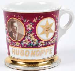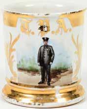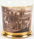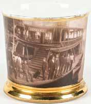 4 - 3/4” x 3 - 5/8” x 3 - 1/2”. Rare photographic image mug of men riding the Germania Boat. Has name F. M. Paloer - Captain in gold gilt. Stamped Eugene Berninghause under base. (Excellent) 500 - 1,500