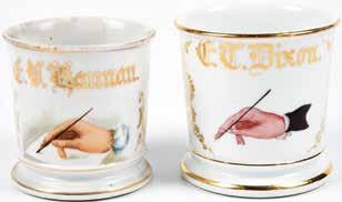 Largest: 4 - 3/4” x 4” x 4”. Both shaving mugs show detailed hands holding a pen. (Excellent) 50 - 100