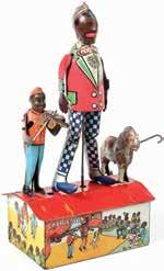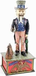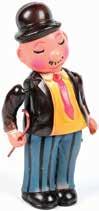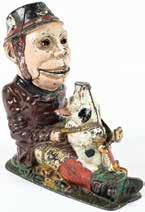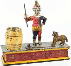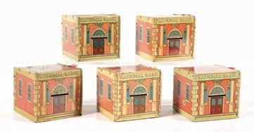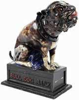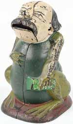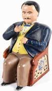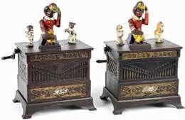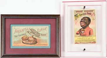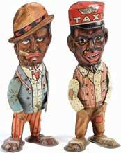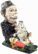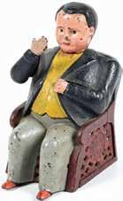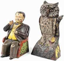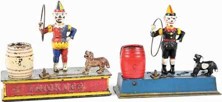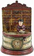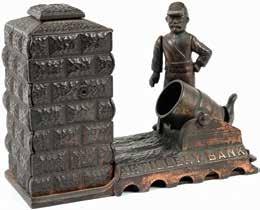 Largest: 4 - 3/4” x 3 - 3/4” x 3 - 3/4”. (A) Bank teller mug, stamped “Koken” under base. (B) Bartender mug with two men toasting. (Excellent +). 100 - 300