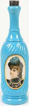 3” x 3” x 10 - 3/4”. Blue base tonic bottle. Nice image of lady. Small hairline in base. (Excellent). 100 - 300
