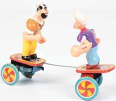 4 - 1/4” x 3 - 1/4” x 3 - 1/2” It has the name “J.M. Adams” in gold gilt. It comes with a floral wrap. The mug is stamped “CFH” under the base. It has an unique image of two men roller skating together. (Excellent) 300 - 800