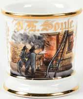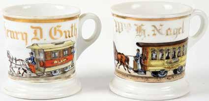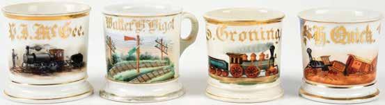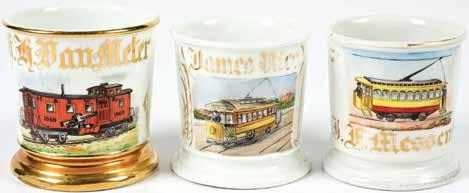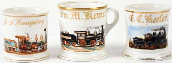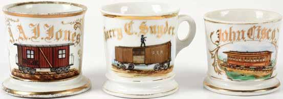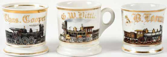 2850 - TRAIN OPERATOR SHAVING MUG. 4 - 3/4” x 3 - 3/4” x 3 - 3/4”. Has the name “H.D. Dillon Jr.” in gold gilt. Detailed image of railway car. (Excellent). 100 - 300