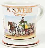 2848 - HORSE-DRAWN DELIVERY WAGON SHAVING MUG 4 - 3/4” x 3 - 3/4” x 3 - 3/4”. Has the name “W.S. Webb” in gold gilt. Nice detailed image of man driving delivery cart. (Excellent) 100 - 300