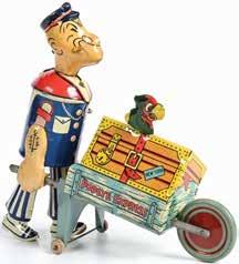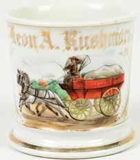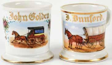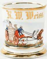 4 - 1/4” x 3 - 1/4” x 3 - 1/2” It has the name “A. Murphy” in gold gilt. There is a nice image of a man driving two passengers. The mug is stamped “Felda China Germany” under the base. (Excellent) 400 - 800