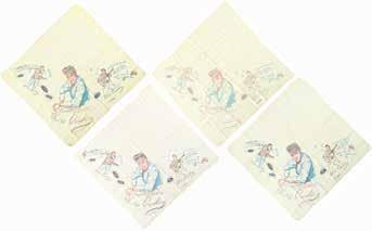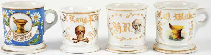Largest: 4 - 3/4” x 3 - 3/4” x 4” All four mugs are druggist shaving mugs, including two mortar and pestle and two skeletal mugs. (Excellent) 300 - 600