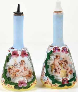 4 - 1/2” x 3 - 1/2” x 3 - 3/4” It has the name “Carl Wolk” in gold gilt. It has a purple wrap, and is stamped “Bavaria” under the base. It has nice detail. (Excellent) 300 - 800