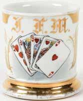 4 - 1/4” x 3 - 1/4” x 3 - 1/2” It has the name “J.F.M.” in gold gilt. The mug is stamped “Germany” under the base. It shows a nice image of royal straight flush. (Excellent) 300 - 800