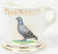 4 - 3/4” x 3 - 3/4” x 3 - 3/4”. Has the name “Chas. Arnold” in gold gilt. Mug is stamped Limoges France.” Signed “Presented by C.M. Kober.” Artist signed. Beautiful detailed image of homing pigeon. Has the words “Average Speed Y.B. Races,” dated 1916 on bottom. (Excellent). 100 - 300