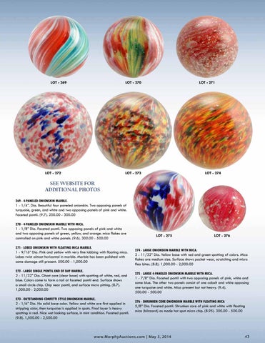 SEE WEBSITE FOR ADDITIONAL PHOTOS 269 - 4-Paneled Onionskin Marble. 1 - 1/4”. Dia. Beautiful four paneled onionskin. Two opposing panels of turquoise, green, and white and two opposing panels of pink and white. Faceted pontil. (9.7). 200.00 - 300.00 270 - 4-Paneled Onionskin Marble with Mica. 1 - 1/8” Dia. Faceted pontil. Two opposing panels of pink and white and two opposing panels of green, yellow, and orange. mica flakes are controlled on pink and white panels. (9.6). 300.00 - 500.00 271 - Lobed Onionskin with Floating Mica Marble. 1 - 9/16” Dia. Pink and yellow with very fine lobbing with floating mica. Lobes twist almost horizontal in marble. Marble has been polished with some damage still present. 500.00 - 1,000.00 272 - Large Single Pontil End of Day Marble. 2 - 11/32” Dia. Ghost core (clear base) with spotting of white, red, and blue. Colors come to form a tail at faceted pontil end. Surface shows a small circle chip. Chip near pontil, and surface micro pitting. (8.7). 1,000.00 - 2,000.00 273 - Outstanding Confetti Style Onionskin Marble. 2 - 1/6” Dia. No solid base color. Yellow and white are first applied in stripping color, then turquoise is applied in spots. Final layer is heavy spotting in red. Nice wet looking surface, in mint condition. Faceted pontil. (9.8). 1,500.00 - 2,500.00