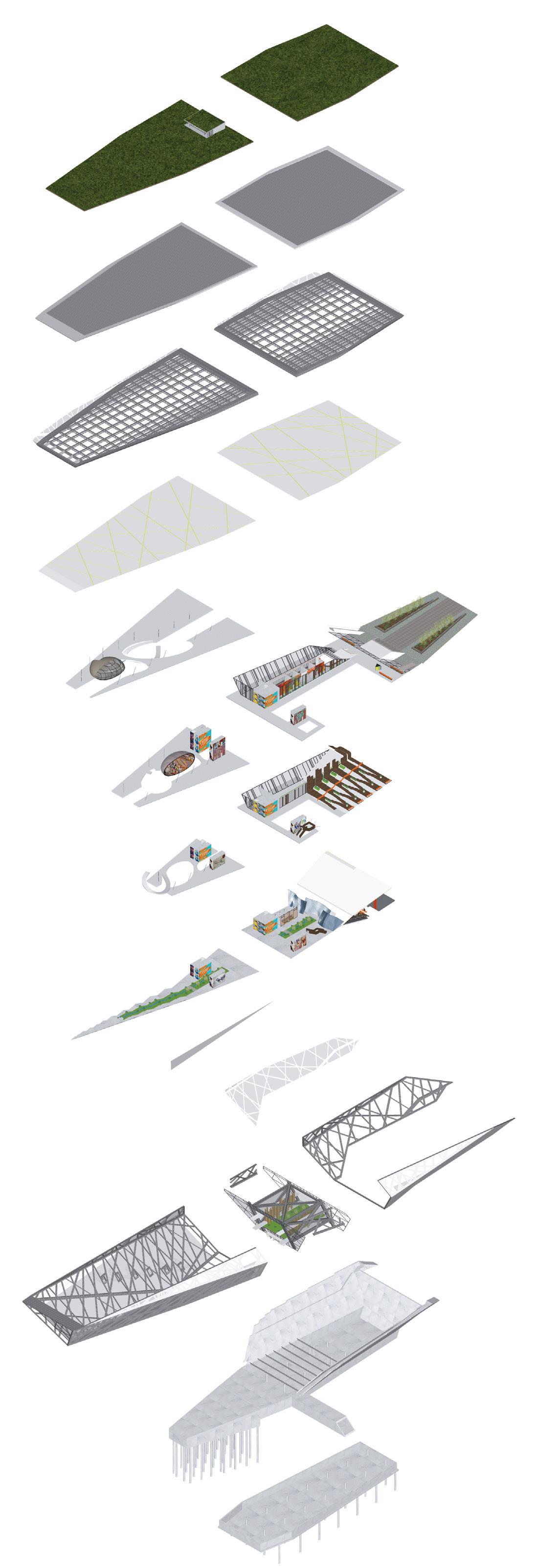 A VESSEL FOR REFUGE IF WATER LEVELS RISE DUE TO UNFORESEEN CIRCUMSTANCES. THE PROPOSAL IMAGINES THAT THE ACTIVITY OF THE EXPOSITION AT THE LLE-SAINTE HELENE AND LLE NOTRE DAME NEVER CEASED SINCE EXPO 1997, AND THAT THESE ISLANDS PERFORMED UNINTERRUPTEDLY AS A CONTINUOUS ACTIVE EXPOSITION SITE. AS THE FICTIONAL SITE FOR THE ACCUMULATION OF INSERTIONS OF ARCHITECTURAL PAVILIONS, THE ARCHIPELAGO HAS RUN OUT OF SPACE AND THEREFORE MUST EXPAND.