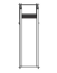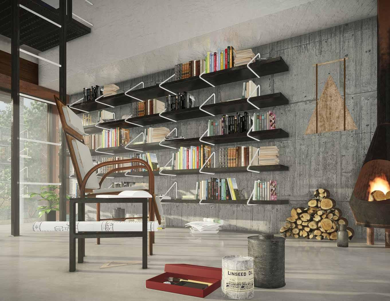 Triangular metal clasp support for wooden shelving. Locally sourced materials with flexibility in amount of shelving required.