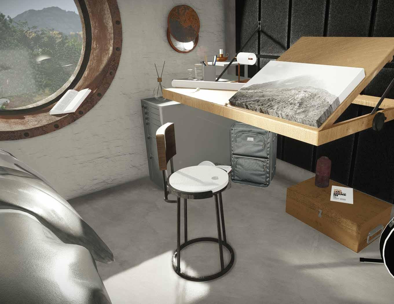 Double lifted drafting table allows flexible workspace for multiple types of artists. Desk is suspended from wall to allow entire table to retract into the wall providing wide open private space.