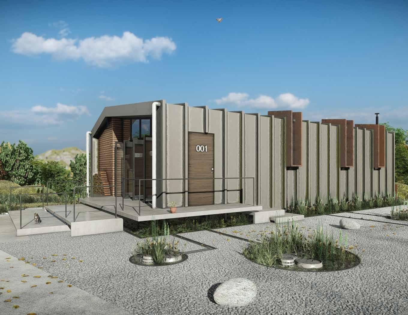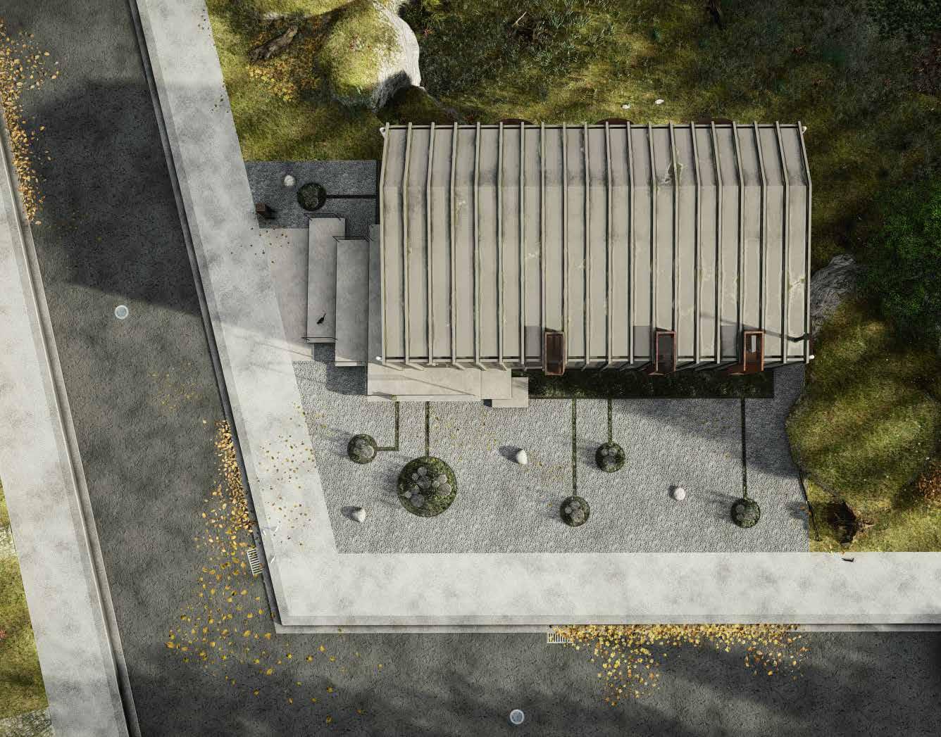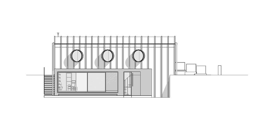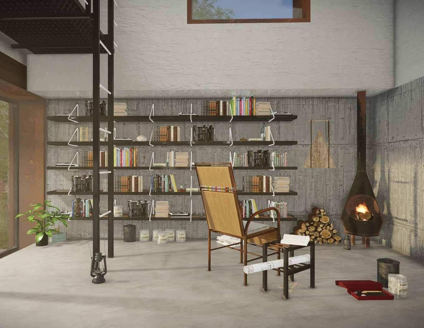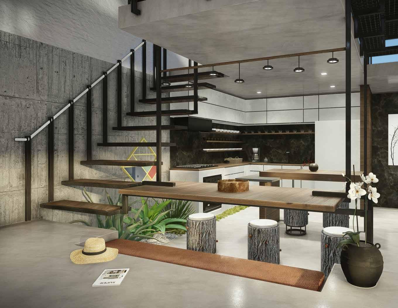 Flexible work space for artists, sliding door to private patio. Drop kitchen adjacet to work space, indoor/ outdoor bar. Open plan with simple flow and transition.