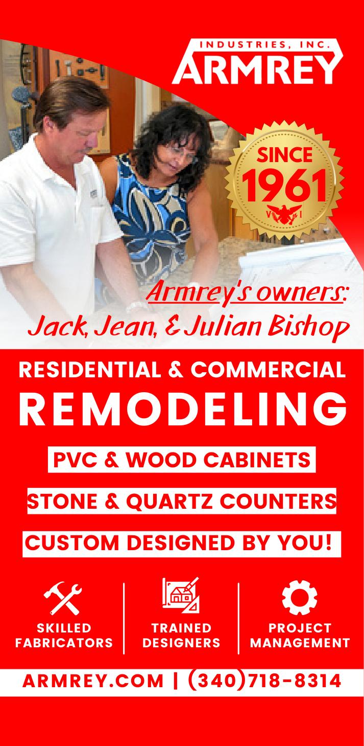 Based on St. Croix, Armrey has been the Virgin Islands’ #1 supplier of Cabinets and Countertops since 1961. Armrey specializes in custom hardwood and PVC cabinets; laminate, quartz, and granite countertops; and more for your kitchen, bathroom, office and other spaces. Armrey’s custom work can be seen in countless residential homes and commercial spaces to include: both territory airports, multiple government agencies including the Legislature, hundreds of housing community units, the UVI Medical Simulation Center, JFL Hospital, Diageo, schools, and more! To learn more, visit our website. To schedule a design consultation and site measurement, call us or stop by our showroom in Estate Richmond, across from WTJX, between Charles Harwood and the