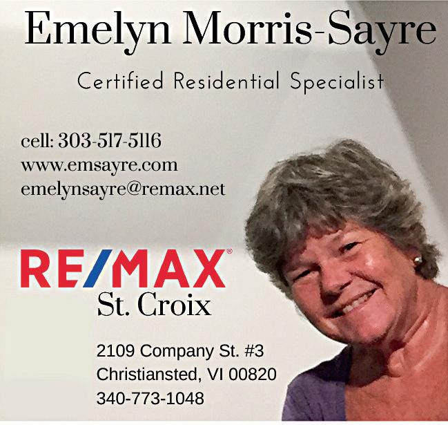 Emelyn brings over 20 years experience to RE/ MAX St. Croix, having previously owned her own real estate in Colorado. She is committed to provid ing exceptional customer service to her clients and customers. Many of her clients return for additional transactions or refer their friends and family know ing they will be treated with the utmost professional ism. Her client’s needs always come first. She has received the prestigious National Association of REALTORS Omega Tau Rho Award for Outstanding Service and she has earned the Certified Residential Specialist designation. Buying or selling, Emelyn would be honored to assist you. Her office is located on Company Street, Christiansted. Call 303-5175116 or office, 340-773-1048. www.emsayre.com