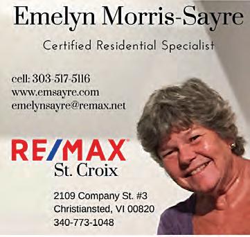 RE/MAX, a name you can trust Globally and Locally for over four decades. Whether you’re buying or selling a home, your success hinges upon the expert advice and services provided by your real estate agent. RE/MAX St. Croix, is a full-service real estate brokerage. Our real estate professionals are committed to providing our clients with personal service based on experience, knowledge and skills. We are always excited to show off our island’s real estate market, customs, and culture. We have the reputation for putting you, the client, first and placing your needs and goals at the top the list. Thinking Real Estate?... Think RE/MAX St. Croix. View a list of our real estate professionals on Page 2 and connect with us today. info@livingonscroix. com, www.livingonstcroix.com
