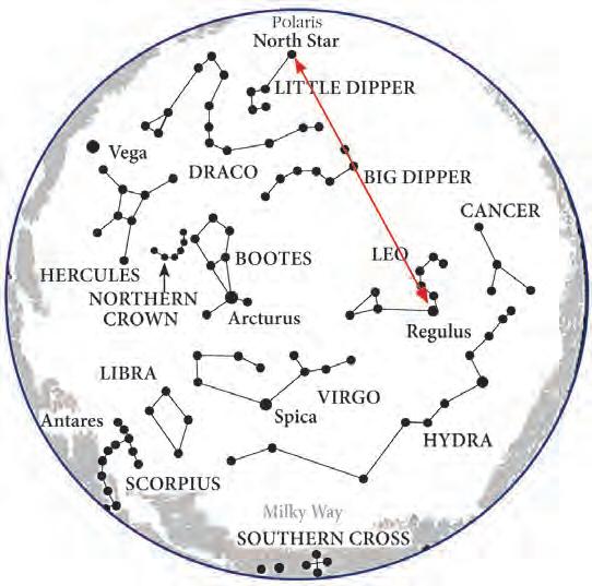 Each bright star marks a different, star group or constellation. Brightest and highest in the sky is Vega, in Lyra the Harp.