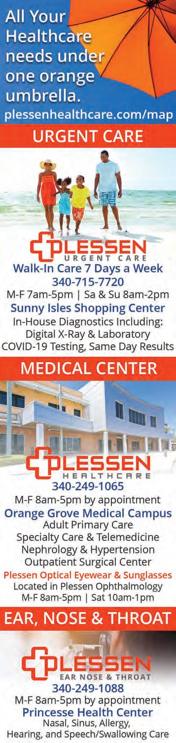 We were founded on the fundamental belief that world-class health care should be accessible to everyone & the workplace should be a joyful & fulfilling practice for the entire team. Plessen’s Orange Grove medical campus includes a full-service, multi-specialty medical clinic & the first CMS accredited surgical center in the USVI. Plessen’s Urgent Care, at Sunny Isle Shopping Center, offers walk-in service 7-days a week for patients 2 & up. Avoid the ER for non life-threatening injuries & illness with in-house digital x-rays & laboratory diagnostics. Most health insurance, Medicare & MAP, accepted. www.plessenhealthcare.com.