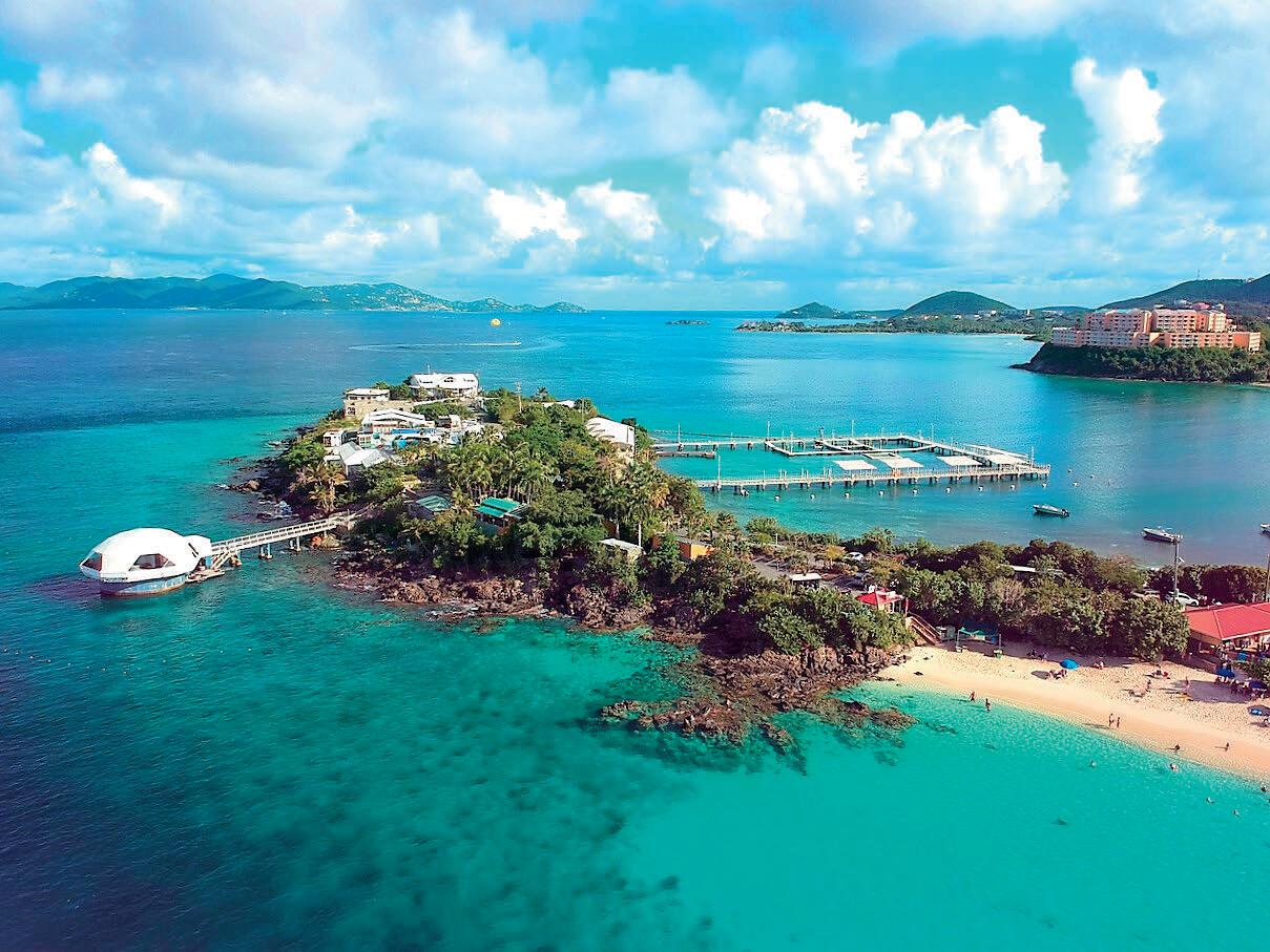Water Island is the smallest of the U.S. Virgin Islands and rests just off the coast of St. Thomas. It is mostly residential but offers fun attractions like Honeymoon Beach and quaint accommodations. The island can be reached by ferry from the Crown Bay Marina or by other vessels.