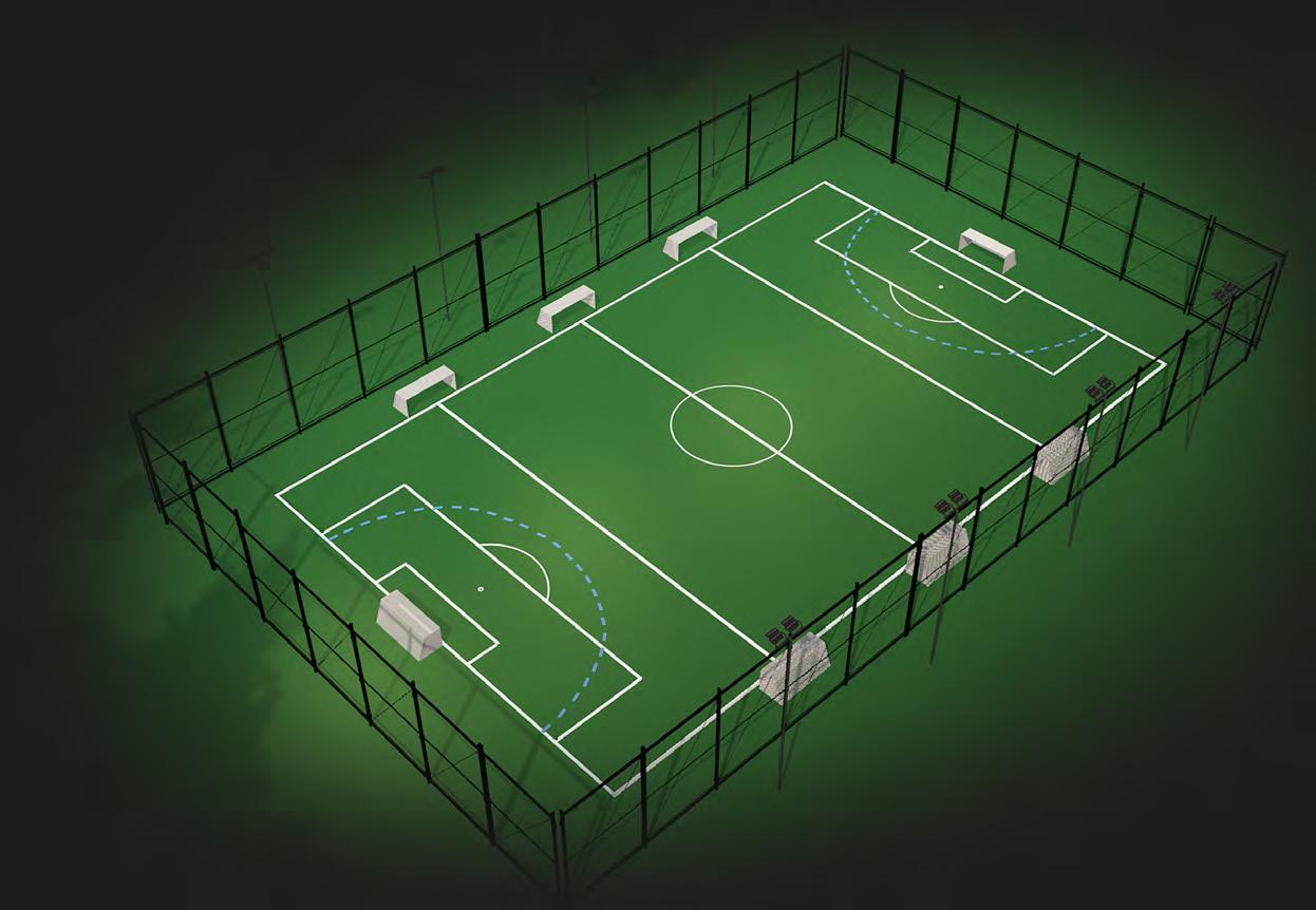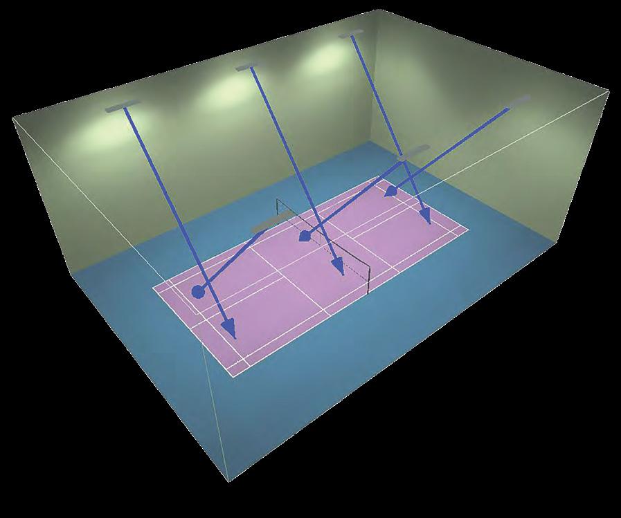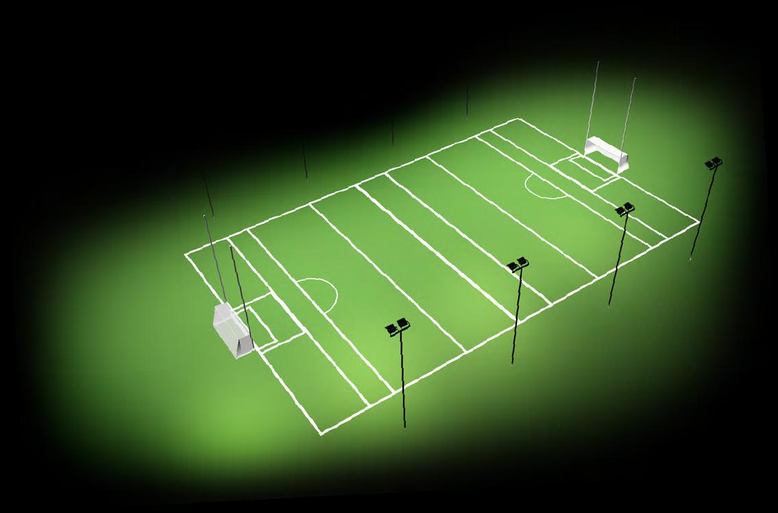 • Siden ballen kan spilles både på bakken og i luften, må belysningen sikre at hele ballbanen er synlig, samtidig som skyggeeffekter reduseres.