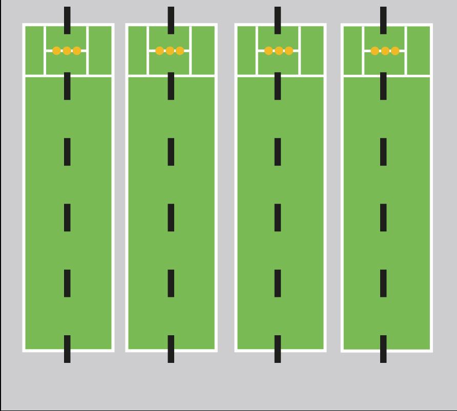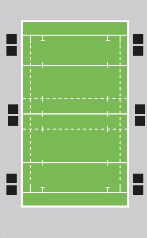 • Det skal være en hinderfri sone på 5 meter utenfor mållinjene og 4 meter utenfor sidelinjene; søyler skal ikke plasseres i disse områdene.