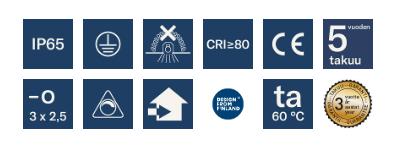 Dimmebar faseavsnitt eller fasepåsnitt; IP65; SL I; L70B50 15000t; Fast integrert LED; CRI>80; SDCM5; Avsluttende; 3x2.5mm²; Kapsling al; Farge trehvit. Tre bør behandles med Badstuvoks (ref:Tikkurilas Supi) før bruk; skjerm i opal plast. Finnes også i sort (9610587).